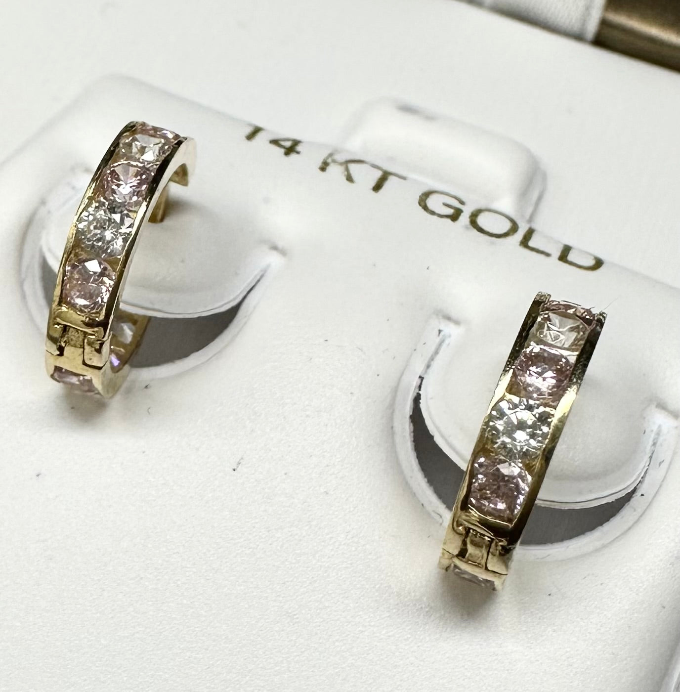 14K YG Huggies Thick CZ Line Pattern Hoop Earring Pink and Clear CZ HU-626M-Pink-Clear
