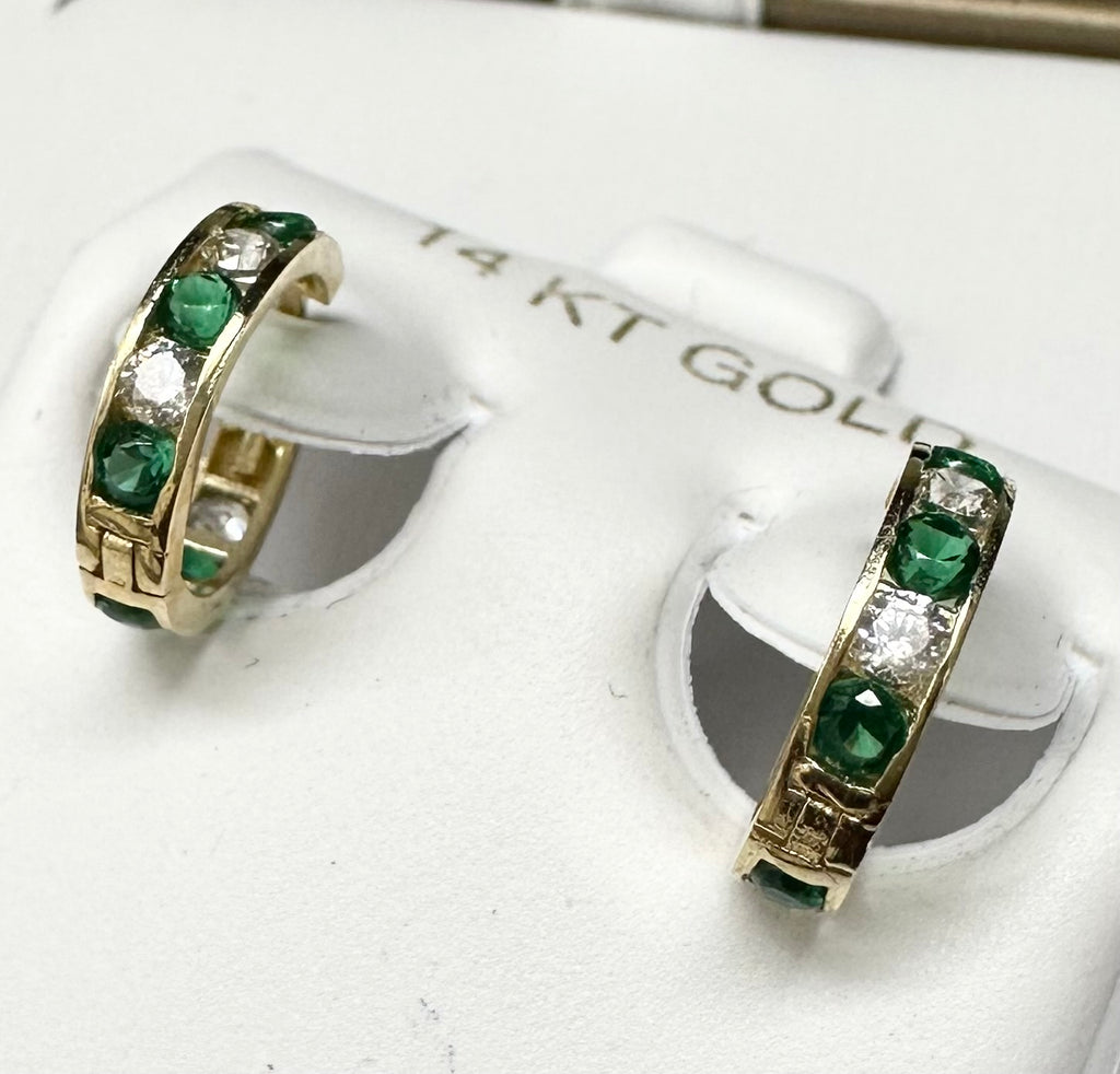 14K YG Huggies Thick CZ Line Pattern Hoop Earring Green CZ HU-626M-Green